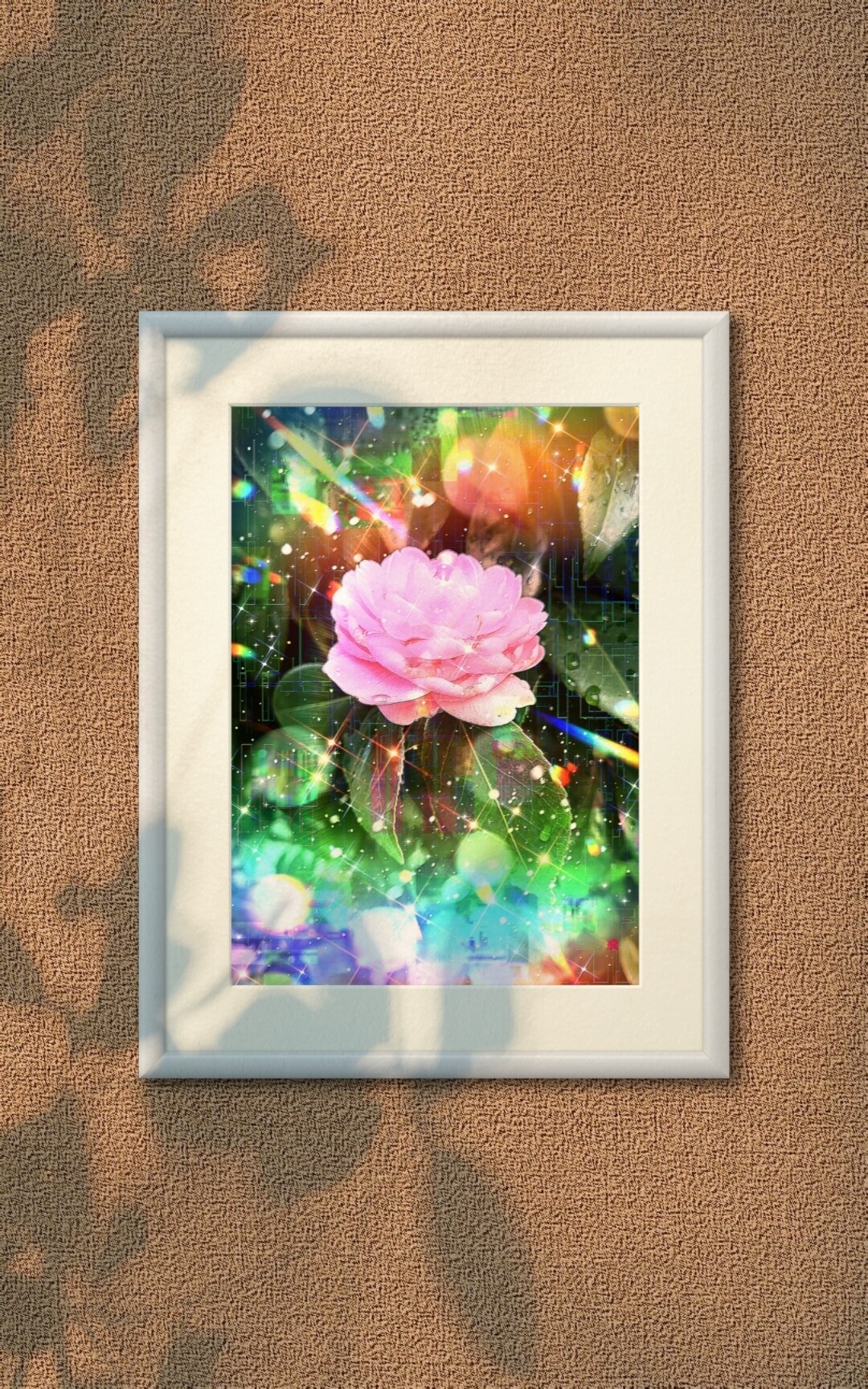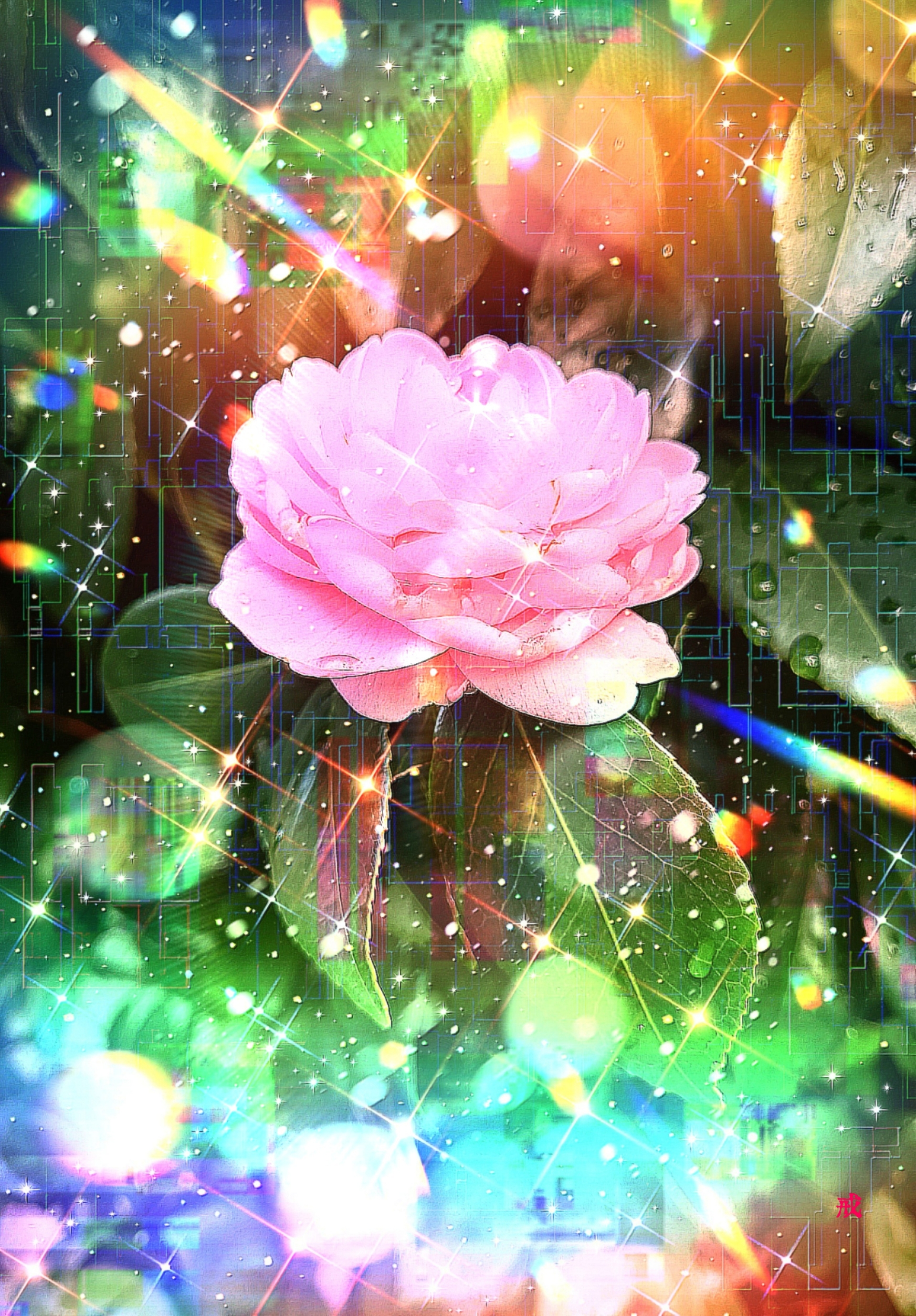 光の表現も印象的です。花びらや背景には光が反射しており、キラキラと輝いています。これは、まるで妖精の国のような幻想的な雰囲気を演出しています。