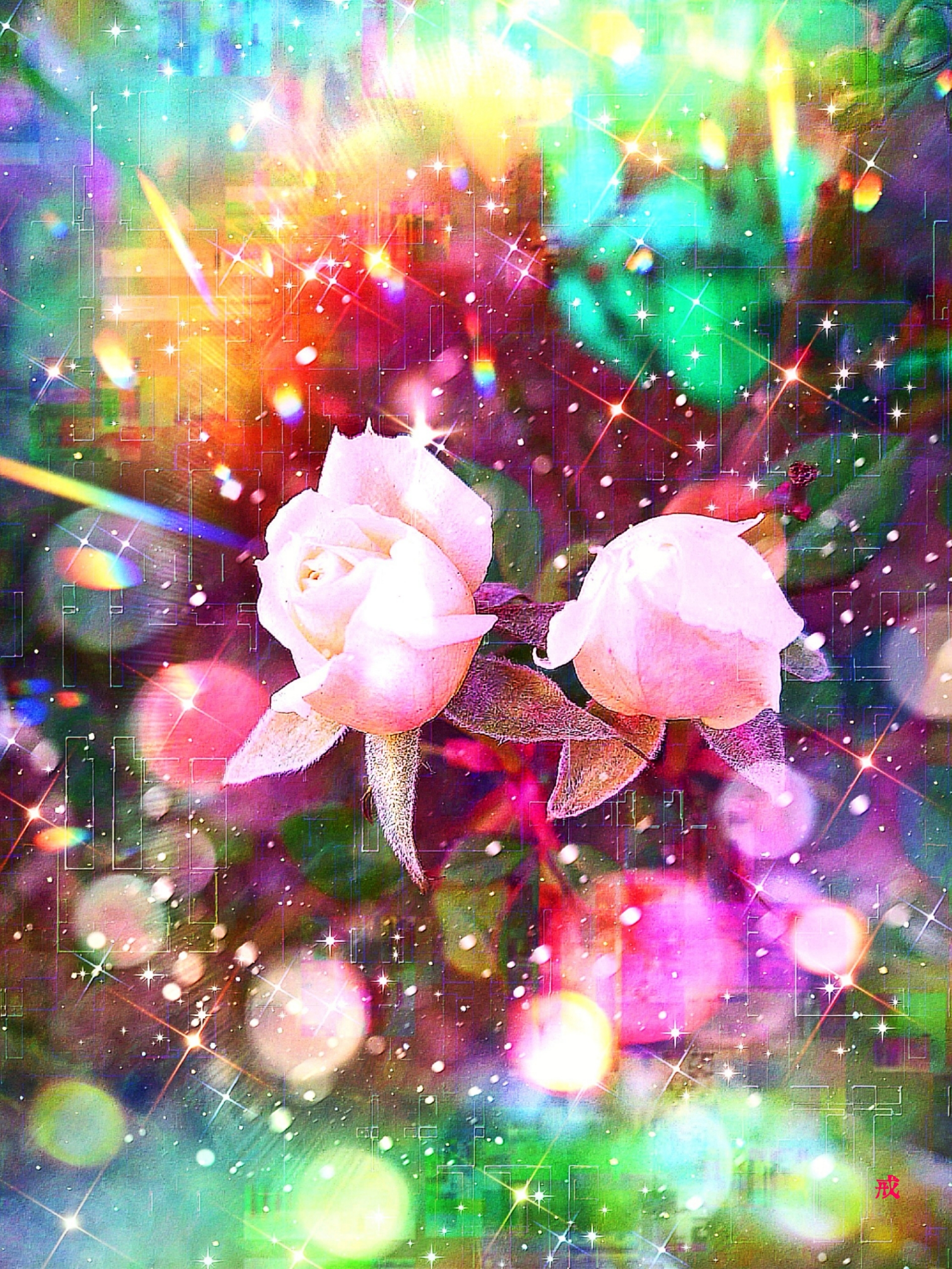 The rose buds in the painting concretely visualize the growth and hope for the future symbolized in the poem. The rainbow light and warm colors visually emphasize the premonition of happiness and gratitude spoken of in the poem. By viewing the painting while reading the poem, a new emotion will be created by the fusion of visuals and literature.