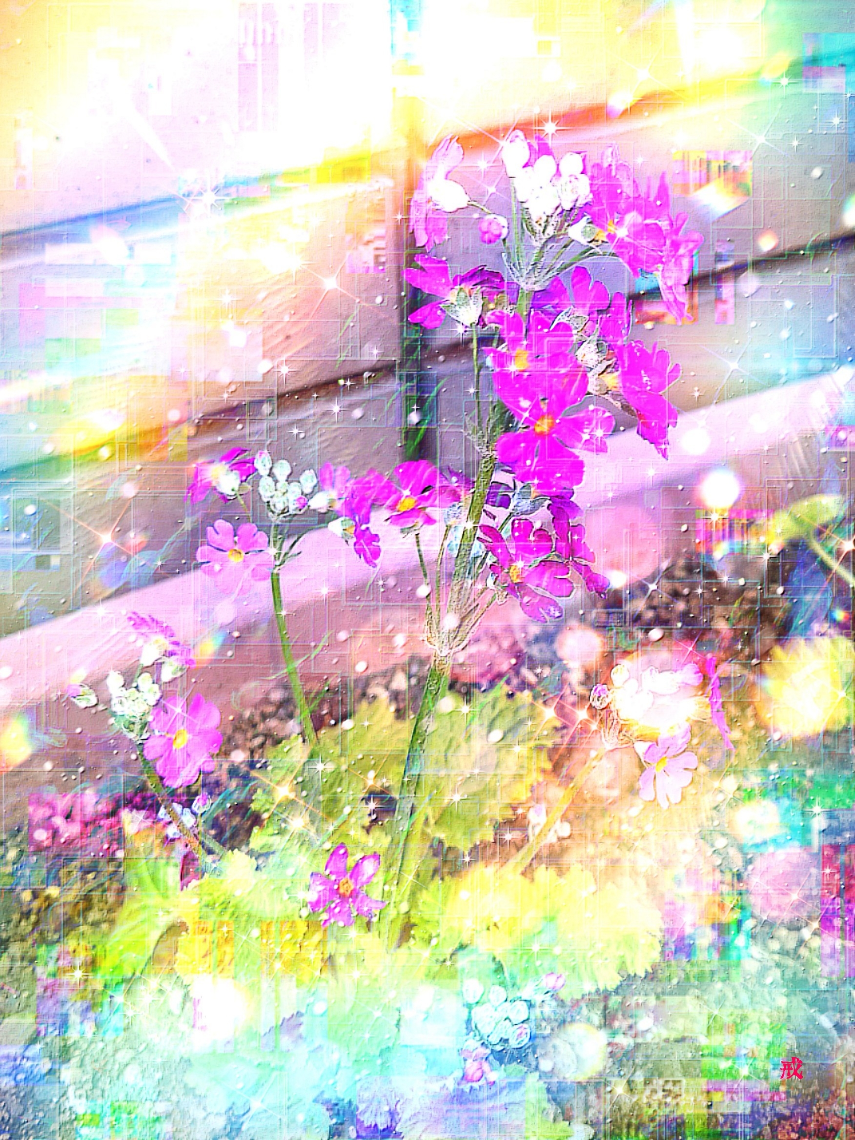 This digital painting exudes a bright and hopeful atmosphere, and gives a delicate and vivid visual impression. The rainbow light in the background and the primrose flowers are emphasized, evoking a sense of happiness and peace in the viewer. Overall, the painting expresses the fresh emotions of first love that sprouts with the arrival of spring.