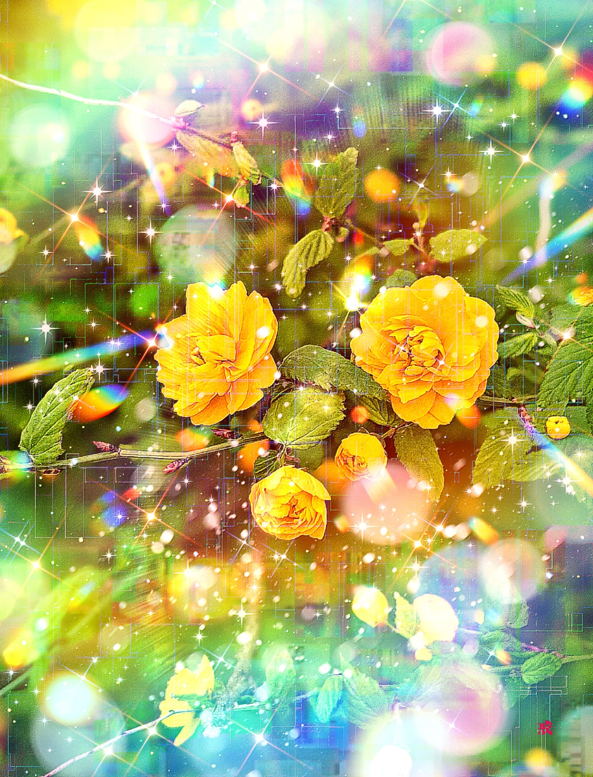画面全体は、春の陽光に満ちた暖かさと、キラキラとした輝きに包まれています。主要な被写体である黄色い花(木香薔薇)は、鮮やかな色彩と光の粒子によって強調され、見る者に喜びと幸福感を与えます。背景の緑も明るく、生命力溢れる春の息吹を感じさせます。全体的にソフトで優しい光の表現が印象的です。