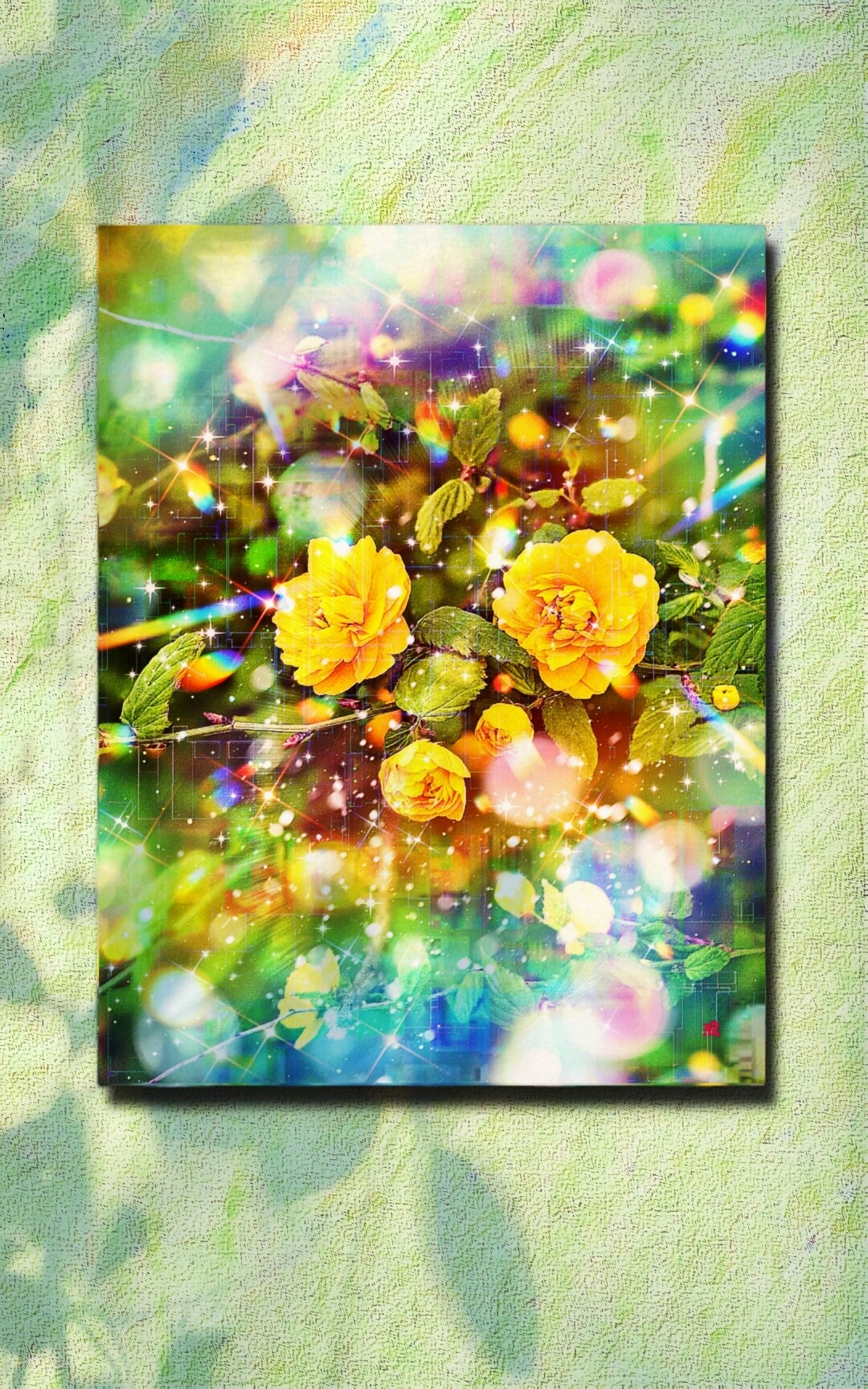主役である木香薔薇の鮮やかな黄色が画面の中心を飾り、見る人の目を引きます。この黄色は、明るさや希望、そして子供たちの純粋な笑顔を象徴していると考えられます。背景の緑は、生命の成長や自然の豊かさを表し、黄色の花々を引き立てています。また、光の表現として用いられている虹色のプリズムや、散りばめられた光の粒子は、夢のような幻想的な雰囲気を演出し、喜びや祝福の感情を増幅させています。