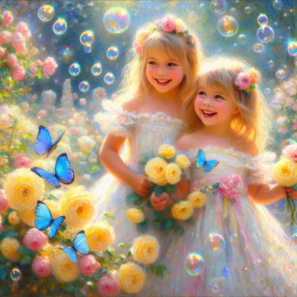 作者の「作成意図」にあるように、この作品は、成長していく娘たちの笑顔と、それを見守る親の温かい愛情が込められています。春の朝の光や虹色のプリズムは、娘たちの未来への希望や、今この瞬間の喜びを象徴的に表現していると考えられます。木香薔薇の花言葉である「幼なじみ」「友情」「無邪気」なども、作品のテーマと深く関連しているかもしれません。