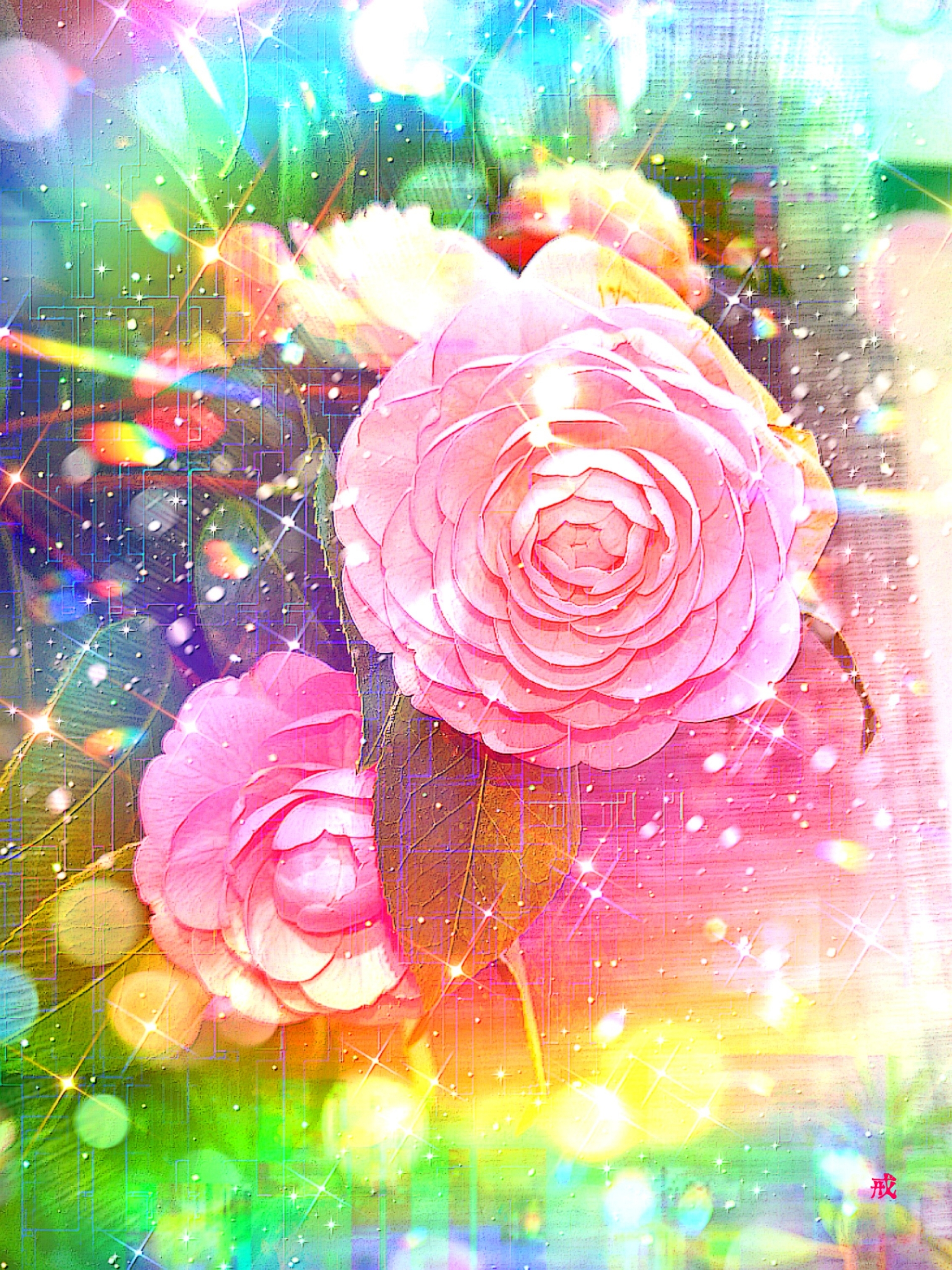 The camellia flowers wrapped in transparent rainbow light create a fantastic atmosphere. The expression of light unique to digital art and the elegance of the camellia, a traditional Japanese flower, are beautifully combined.