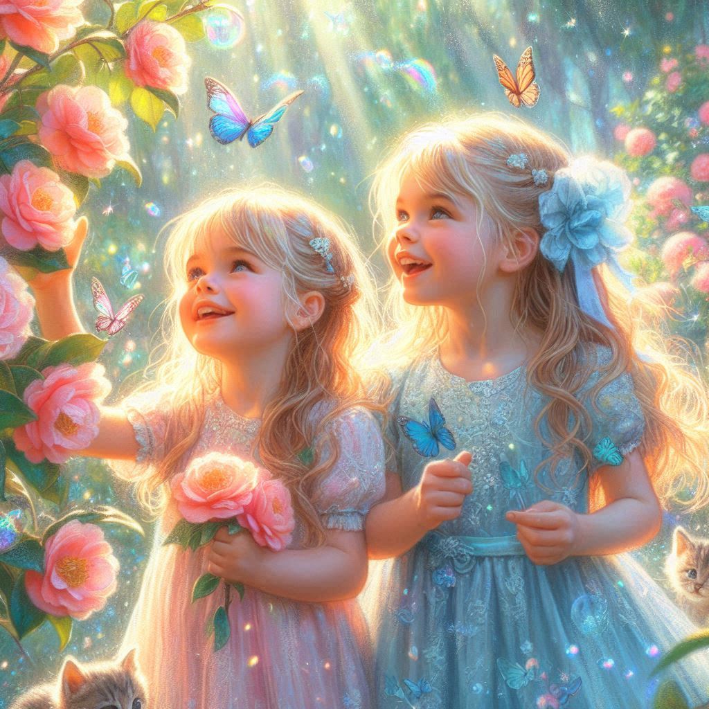 The artist expressed the growth of his daughters, the scene of them playing with smiles full of hope, through the bright rainbow light of the morning, and the bursting prism of light.