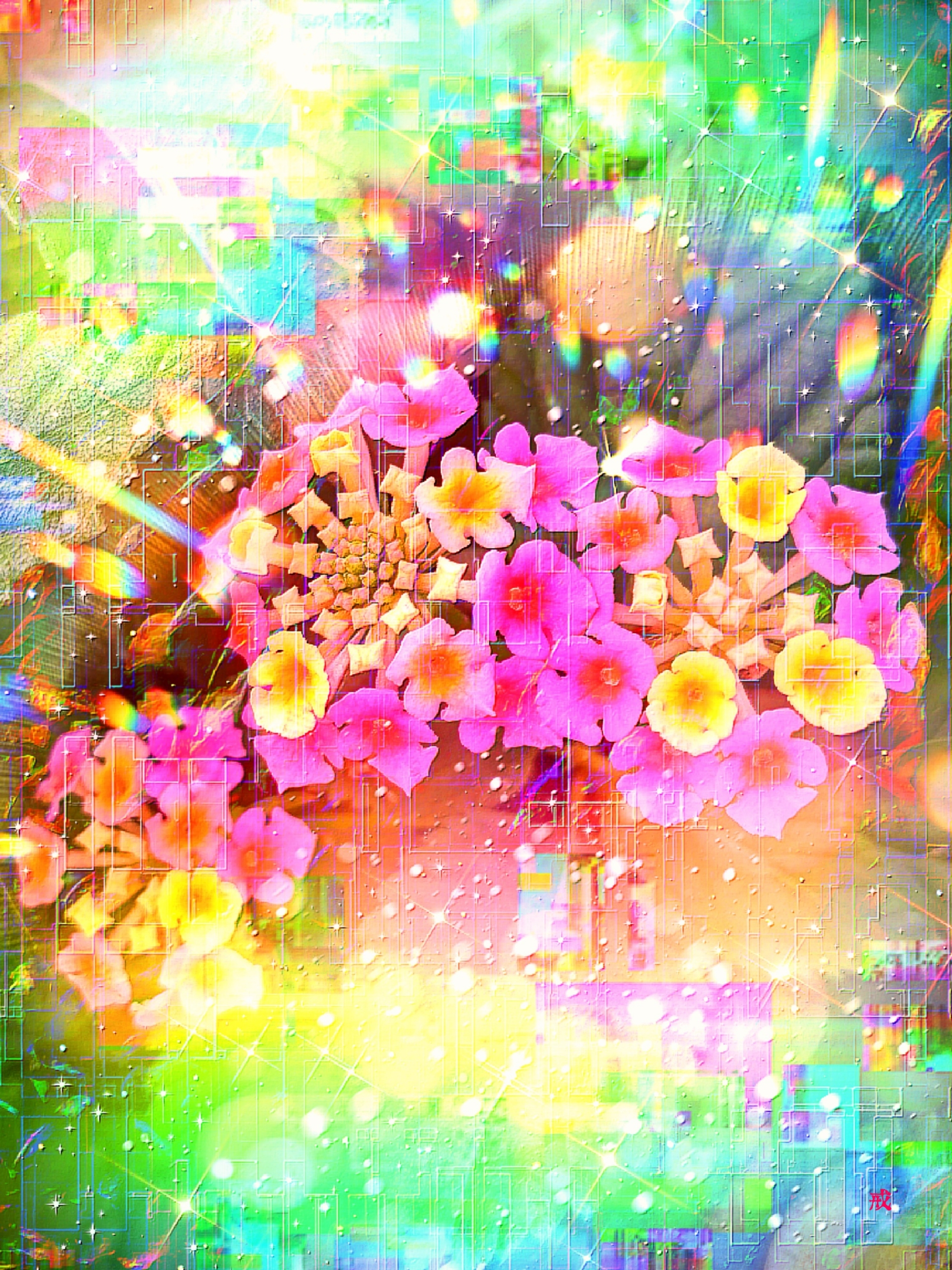 この作品は、幻想的な光に包まれたランタナの花が静謐さと華やかさを同時に醸し出しています。デジタル処理による光の粒子感と、ピンク、黄色、オレンジの温かい色彩が混ざり合い、初夏の光に照らされた特別な瞬間を切り取っています。背景の緑や青のグラデーションは、まるで宇宙と地上が融合したような超越的な空間を創出しています。