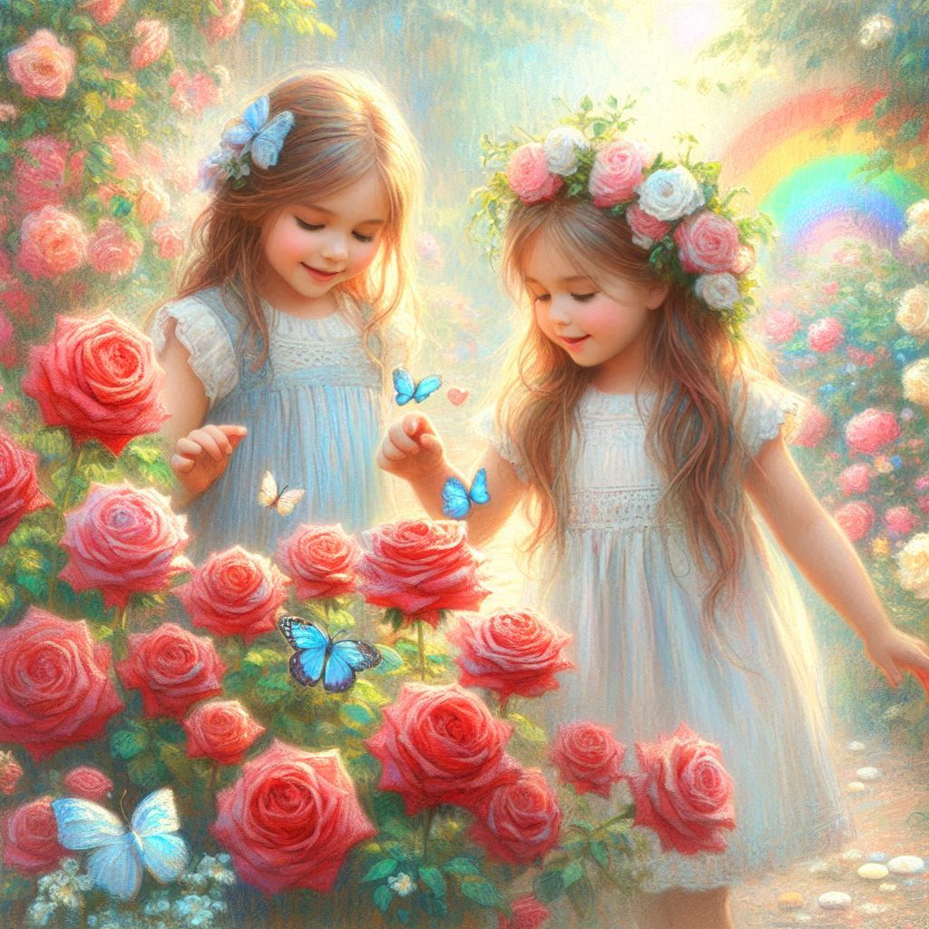 作品は、夏の赤い薔薇(Red rose)の花を通して、初夏への変化の中で家族が幸せに包まれる様子を描きました。虹色の光や弾けるシャボン玉が、まるで娘たちの笑顔や無邪気な心を映し出すかのように表現しました。赤い薔薇(Red rose)の花は、家族と過ごす初夏の穏やかな日や、未来への希望を象徴し、娘たちの成長が移りゆく季節とともに花開くことを暗示します。