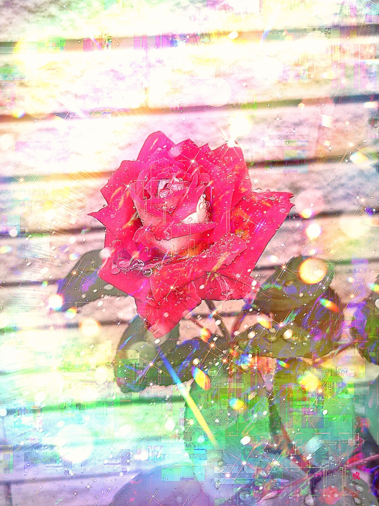 鮮やかな赤い薔薇を中心に、背景には淡い虹色のグラデーションが広がっています。水滴の光る様子がキラキラとした輝きを放ち、夢幻的な雰囲気を醸成しています。