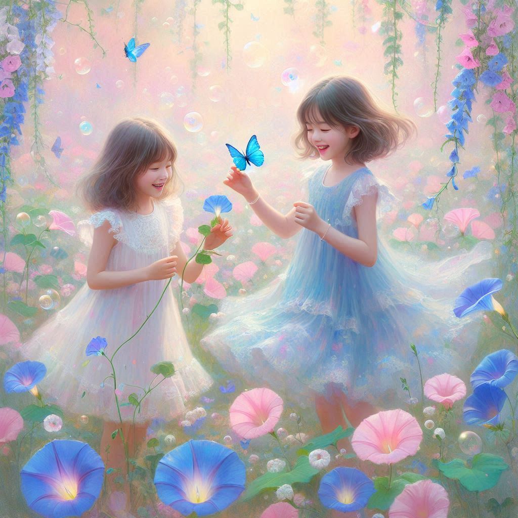 作品は、夏の黄色い朝顔(Morning glory)を通して、初夏への変化の中で家族が幸せに包まれる様子を描きました。虹色の光や弾けるシャボン玉が、まるで娘たちの笑顔や無邪気な心を映し出すかのように表現しました。朝顔(Morning glory)は、家族と過ごす初夏の穏やかな日や、未来への希望を象徴し、娘たちの成長が移りゆく季節とともに花開くことを暗示します。