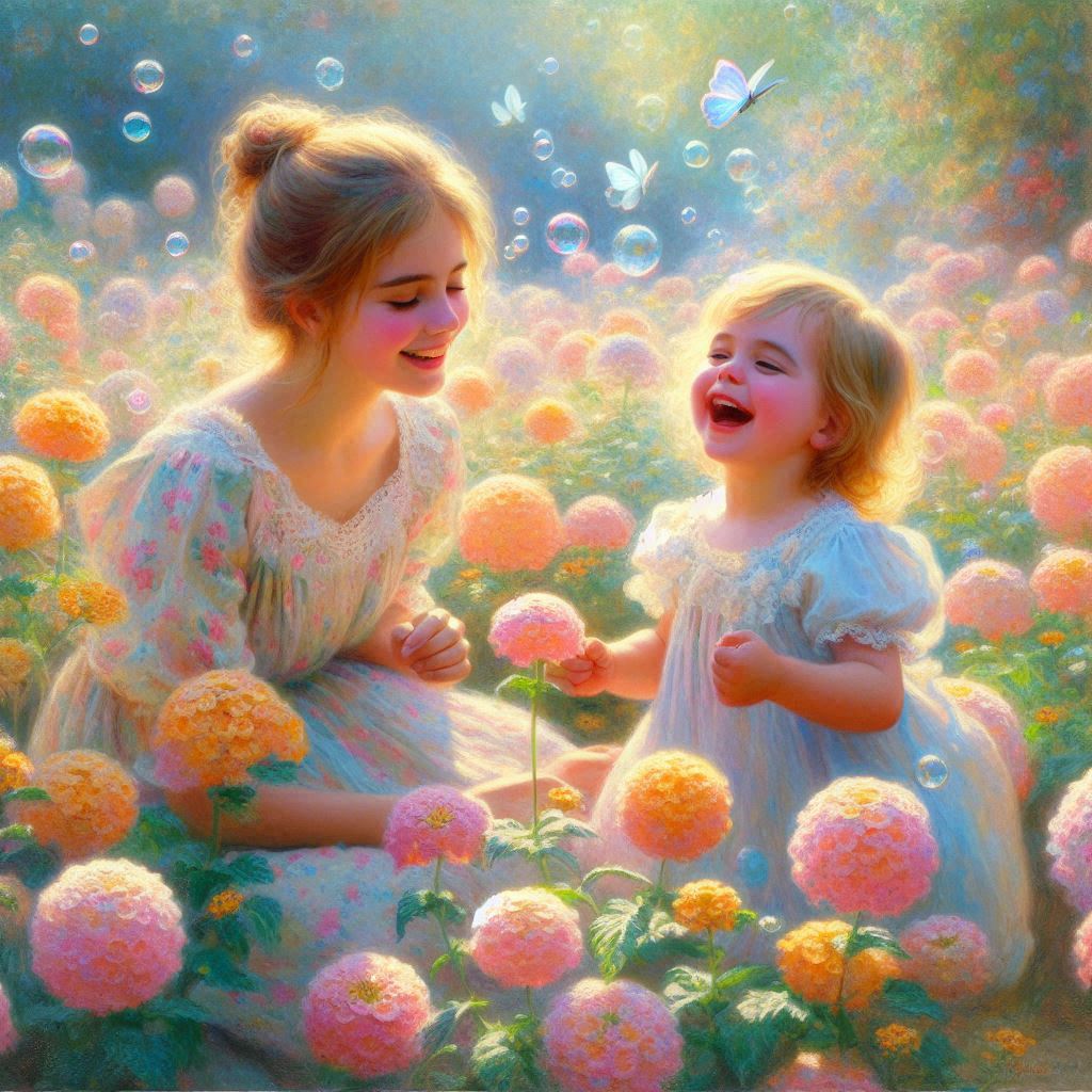 子どもたちの純粋な喜びや、花を愛でる瞬間の輝きを、抽象的かつ幻想的に表現することに成功しています。