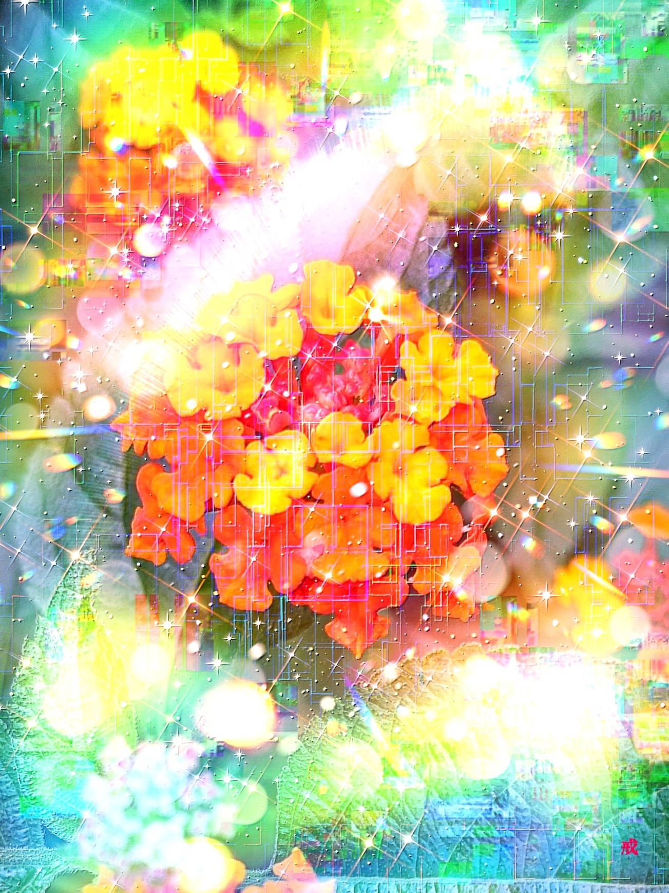 多彩な色彩が織りなす幻想的な光の世界が広がっています。中央に配置されたランタナの花が、まるで光の粒子と共に踊るように描かれており、清々しい朝の庭園の雰囲気を見事に表現しています。