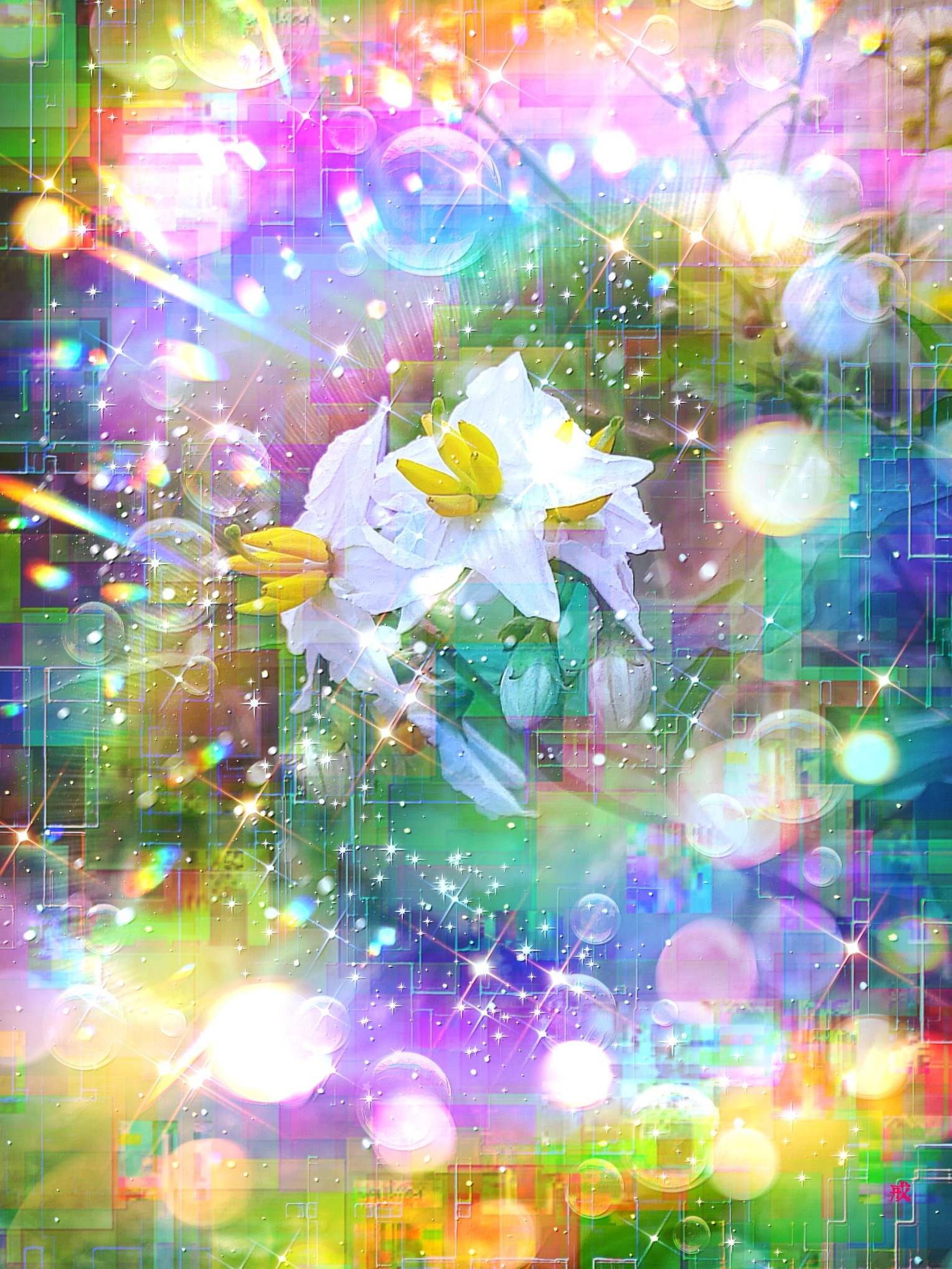 このデジタル絵画は、鮮やかな色彩と光の効果を駆使して、作者は、子供たちが庭で遊ぶ幸せな雰囲気を思い浮かべ描いています。中心に描かれた茄子の花(Solanum carolinense)とシャボン玉が、ノスタルジックで幸福感に満ちた雰囲気を醸し出しています。