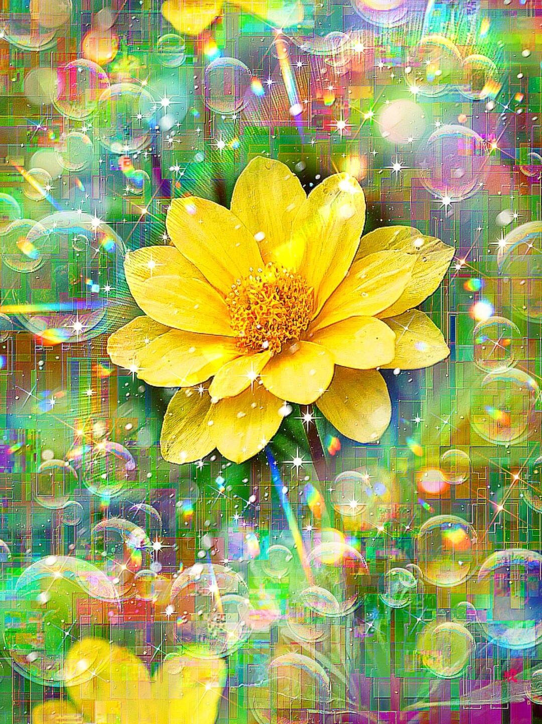 デジタル絵画「春の息吹 Harbinger of Hope」は、早春の晴れた朝、庭に咲く福寿草の花をモチーフにした作品です。黄色い福寿草の花は画面の中央に大きく描かれ、周囲には虹色のシャボン玉が漂っています。背景は青、緑、ピンクなどの鮮やかな色彩で表現されており、春の訪れを告げるような明るい雰囲気を醸し出しています。