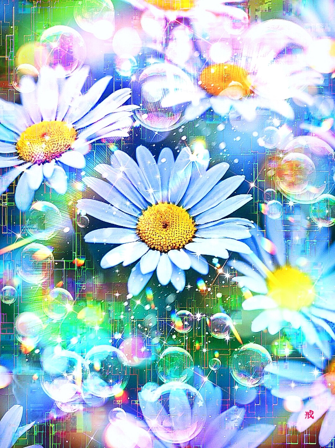 この絵画は、春の日差しに照らされた白いデージーの花の美しさを繊細に表現しています。花びらの質感や光沢、周囲の空や草木まで丁寧に描かれており、見る人に春の訪れを感じさせるような作品です。また、虹色の背景は、希望や夢を象徴しているようにも見え、見る人に明るい気持ちを与えてくれます。