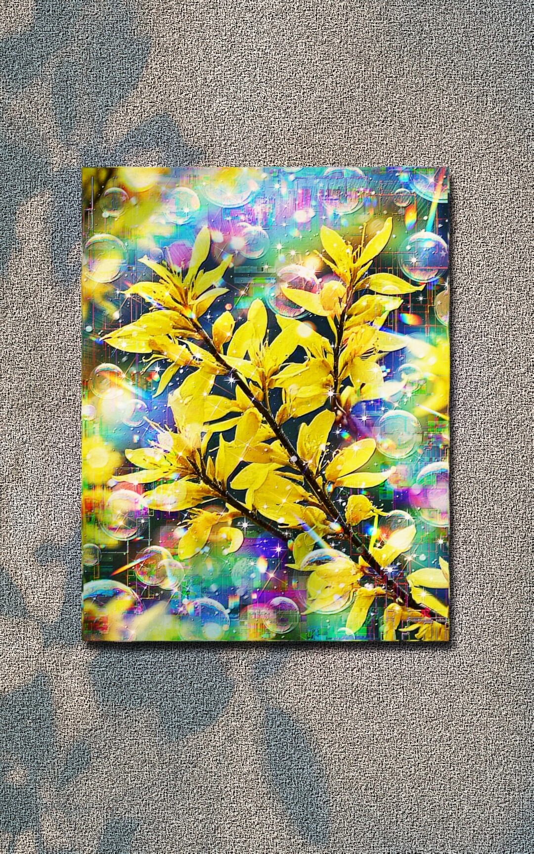The yellow and green leaves are accentuated by the surrounding colorful lights and bubbles, matching the morning light theme.