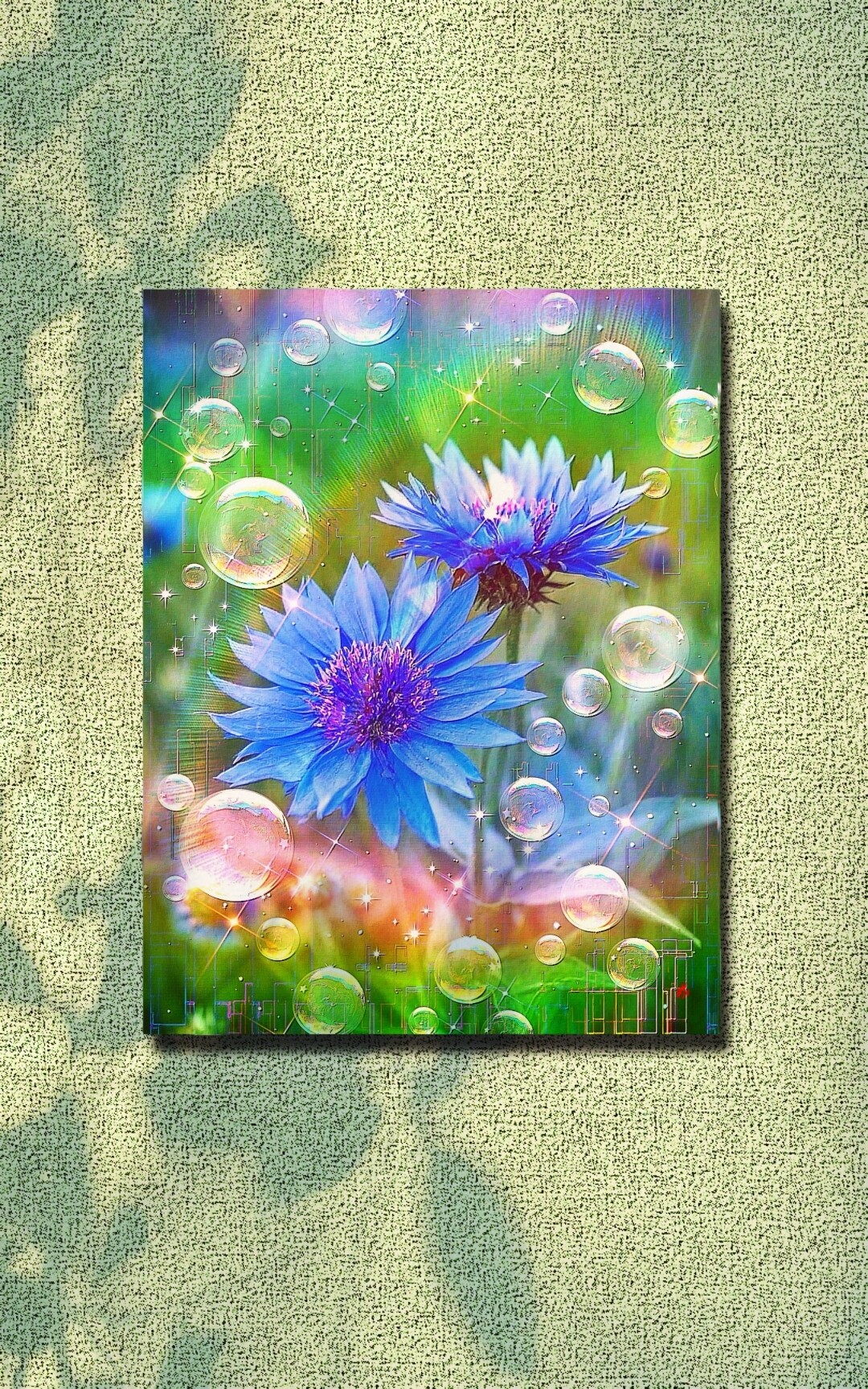 添付のデジタル絵画「春光の祝福 Serene Serenity of Spring」は、静寂と平和に包まれた春の朝を描いた作品です。青色の花びらを広げる矢車菊の花を中心に、空には虹が架かり、周囲には緑豊かな草木が生い茂っています。全体的な色合いは青と緑で統一されており、静けさや清涼感を感じさせる雰囲気となっています。