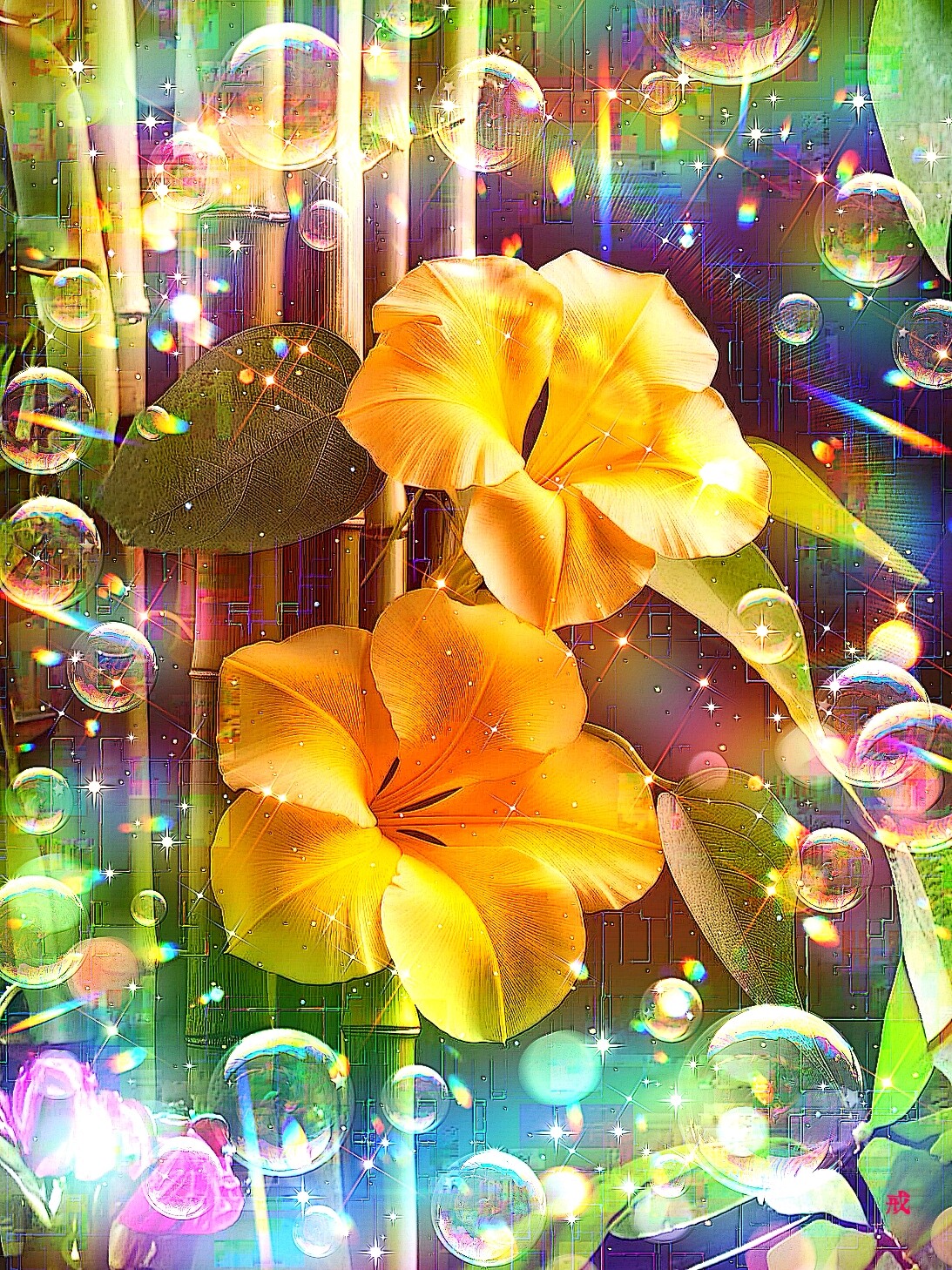 詩:夏光に浮かぶ幻花 Nostalgic Summer Glow 夏の光に照らされて 竹林の中で咲く 幻の黄色い花 虹色の光が包む 希望に満ちた 子らの笑顔 家族の絆 無邪気な笑い声 儚い花の美しさ 永遠に続くように感じる 夏の一瞬の輝き 静寂の中で 夏光に浮かぶ幻花 Nostalgic Summer Glow -戎- Poetry. ”Nostalgic Summer Glow” In the summer's light, Amidst the bamboo grove blooms A phantom yellow flower. Rainbow hues embrace The hopeful smiles Of children. Family bonds, Innocent laughter rings. The fleeting beauty of flowers, Seemingly eternal, In the summer's fleeting brilliance. Within the silence, A phantom flower floats in summer light. Nostalgic Summer Glow -Kai- God bless you.
