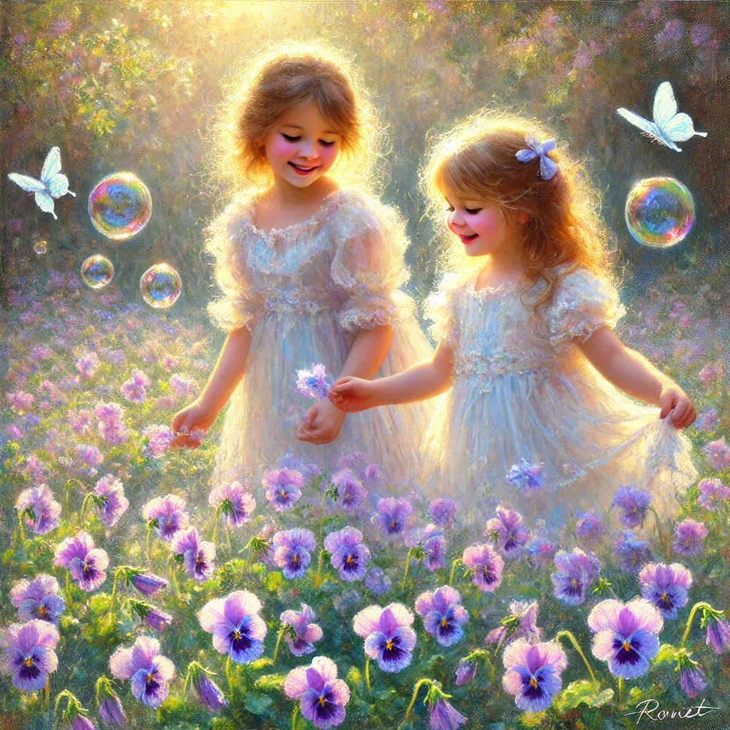 朝の陽の射す庭で、自分の娘達が楽しそうに談笑しながら庭のビオラ(Viola)を愛でながら、遊んでいる様子を思い出し描きました。