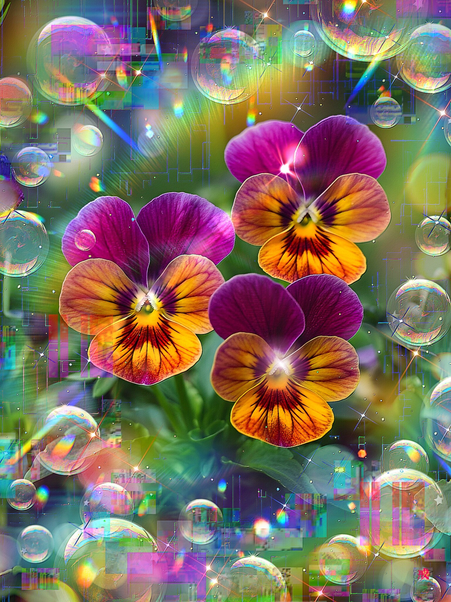 虹色のプリズムや光の反射が、幻想的で夢のような雰囲気を作り出しています。ビオラの紫と黄色が鮮やかに配置され、背景の柔らかな緑と光の屈折が美しいコントラストを生んでいます。シャボン玉のような光の粒が作品に動きと立体感を加え、希望と喜びの象徴として輝きます。