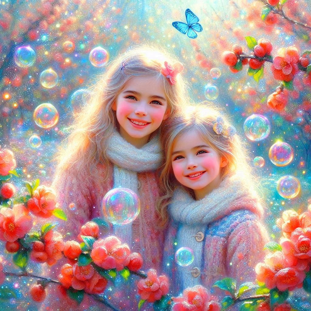 The artist expresses the scene of his daughters growing up and playing with smiles full of hope through the light of a sunny morning and rainbow-colored prisms.