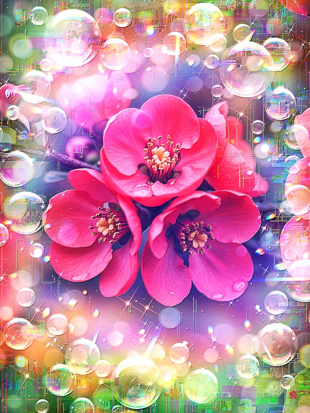 中心に配置された木瓜の花が視線を引き付け、その周囲を囲む光のエフェクトやシャボン玉が、作品全体に流動的なリズムを与えています。
