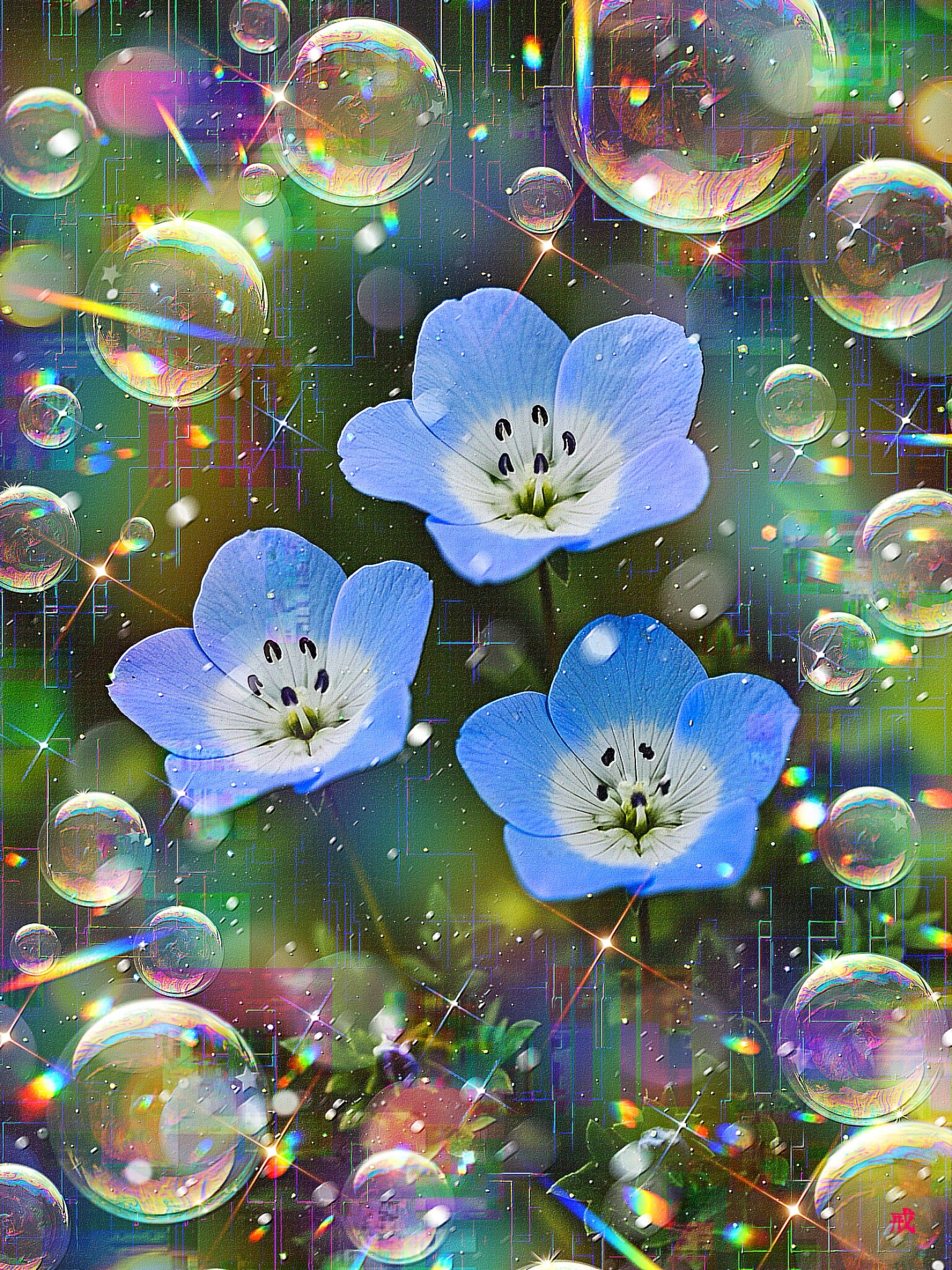 中央に三輪のネモフィラを配置した三角構図は、安定感と調和をもたらしています。この三つの花は家族の絆、特に作者の娘たちを象徴しています。周囲を取り巻くシャボン玉は円形を描きながら画面全体に広がり、生命の循環と無限の可能性を表現しています。垂直方向の光線は天からの祝福を、水平方向のデジタルライン効果は現代性と時間の流れを暗示しています。