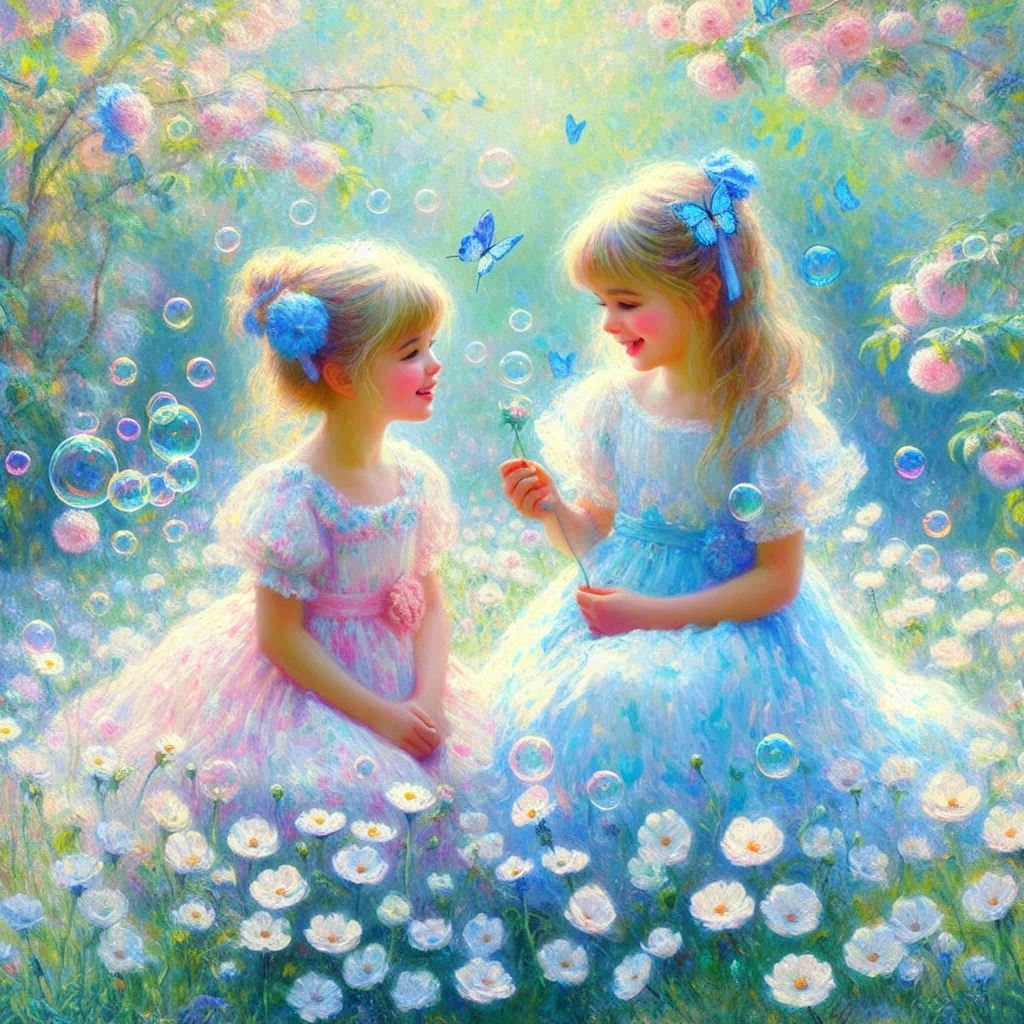 特筆すべきは、両作品が「静と動」の調和を表現している点です。絵画では静止した花と動きのあるシャボン玉や光の粒子が、詩では「静かな庭」と「弾ける泡」が対比されています。この対比によって、子どもたちの成長という変化の中にも変わらない家族愛という永続性があることが暗示されています。